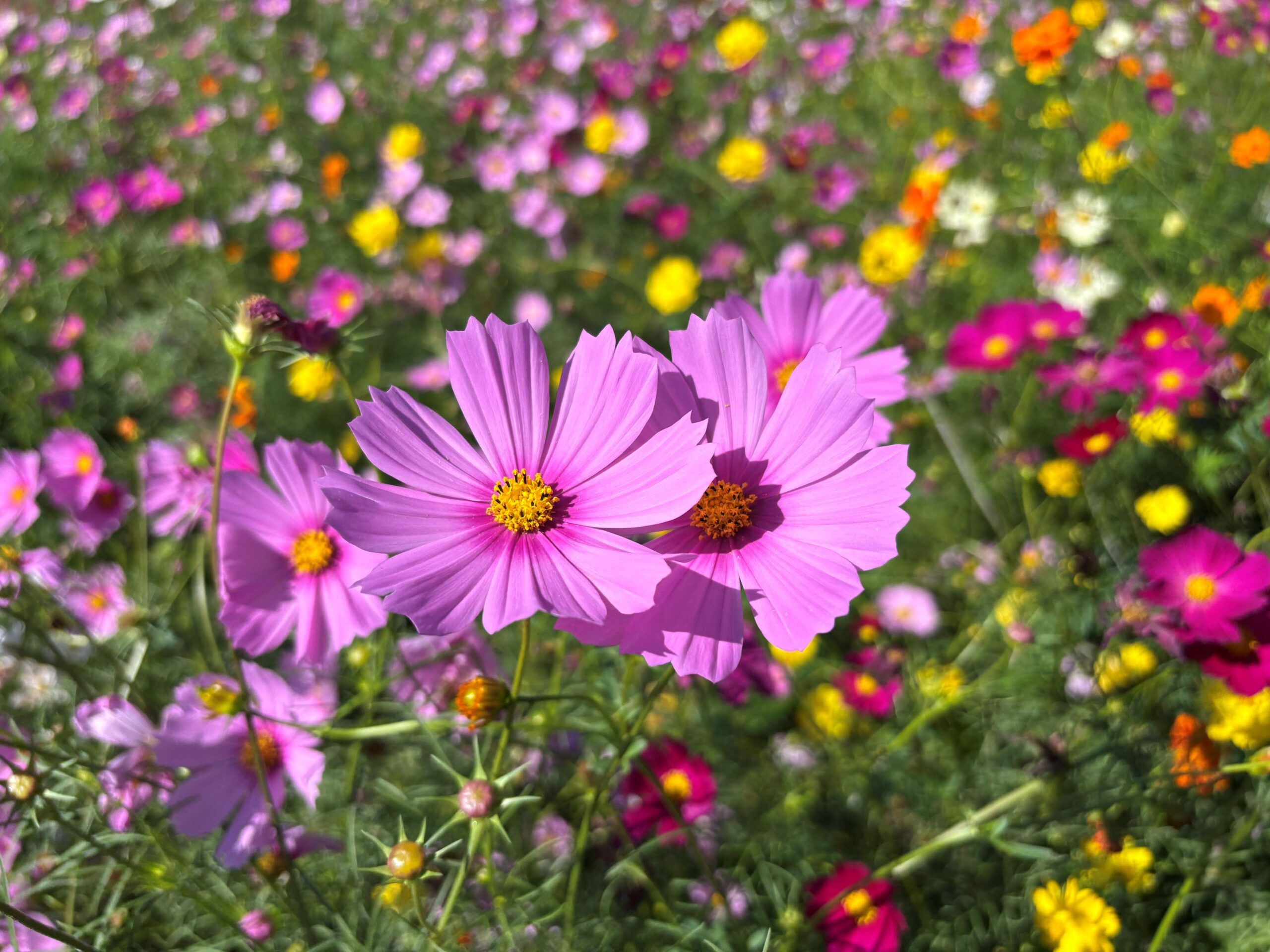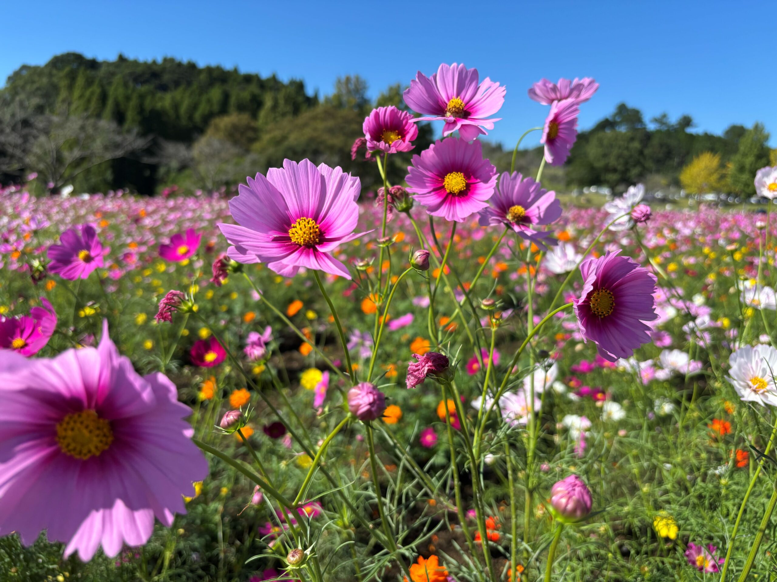 皆様、こんにちは。 先日、妙円寺詣りで歩いた後、コスモスを見に行ってきました。 ちょうどいいタイミングだったようで、コスモスは見頃を迎えていました。 天候に恵まれ、澄んだ青空と色彩豊かなコスモスが、とても綺麗でした。 お花のお手入れをして下さっている方に感謝しながら、ゆっくりと散策を楽しみました。 秋を満喫した1日となりました。